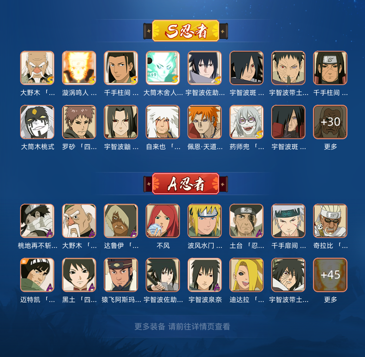 装备描述:46S,63A,285忍,三柱间,忍战带土,漂泊扉间,天道超,298小孩带皮肤,328鲛肌融合