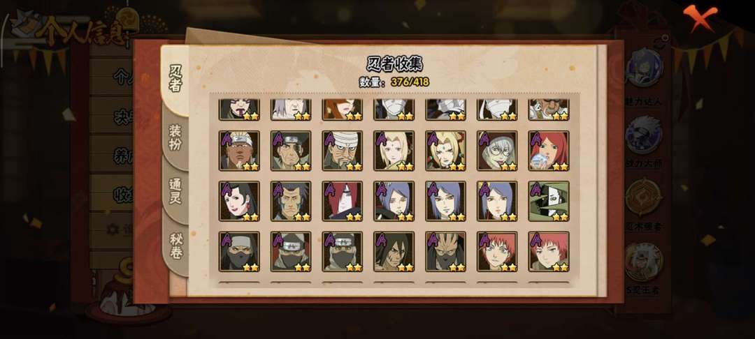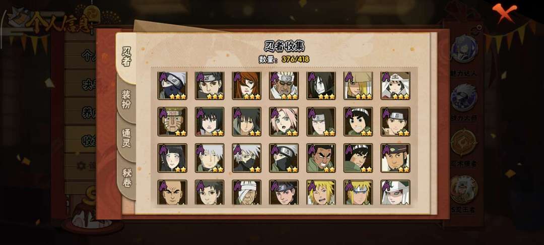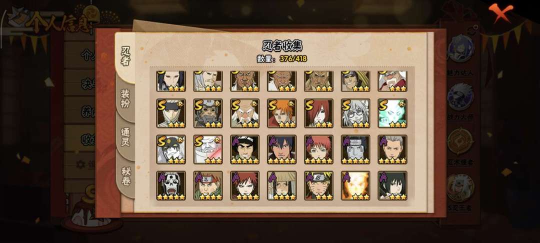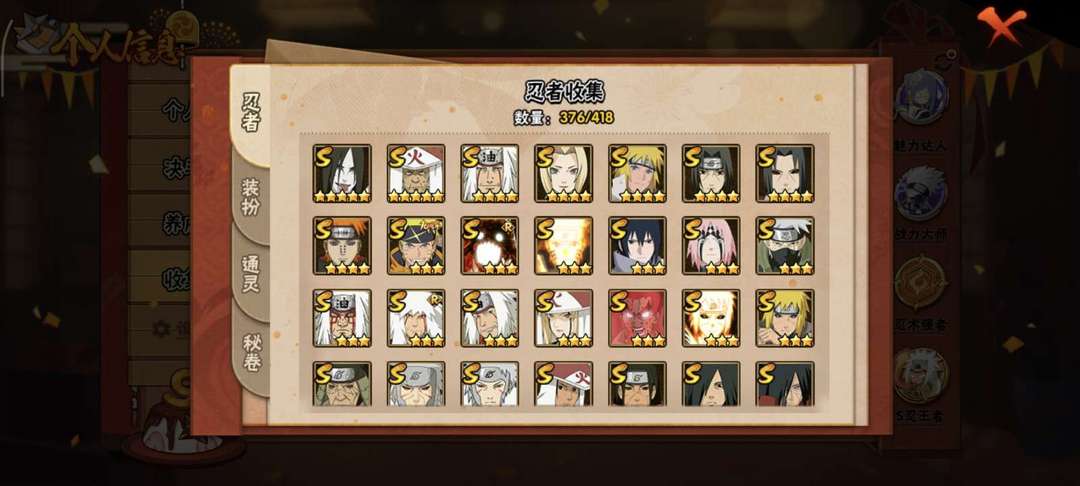 限制: 租号1次及以上 |装备描述:51s,秽土转生水门,秽土转生三代,秽土转生三代,千手柱间,宇智波斑,千手扉间,秽土转生二代,天道佩恩,百豪纲手,神秘面具男,白面具斑,须佐能乎鼬,鬼灯幻月,秽土转生半藏,秽土转生长门,秽土转生金角银角,二代土影无,自来也,大蛇丸,秽土以上就是目前s忍者后期会陆续更新 86a忍惊门凯,晓创生蝎,新春水门,新春鼬,新春小南,绝,三船,夏日泳装小南,夏日泳装照美冥,漂泊武士再不斩,忍界大战卡卡西,以上是a忍氪金忍者, a忍高招忍者,仙鸣,神威卡卡西,百豪樱,木叶丸,万花筒写轮眼左助,忍界大战我爱罗,忍界大战秋道丁次以上举例a忍高招全有 b忍126个 c忍差2个 秘卷全有 通灵熊猫,螃蟹,一尾,二尾,万蛇,公牛,文太