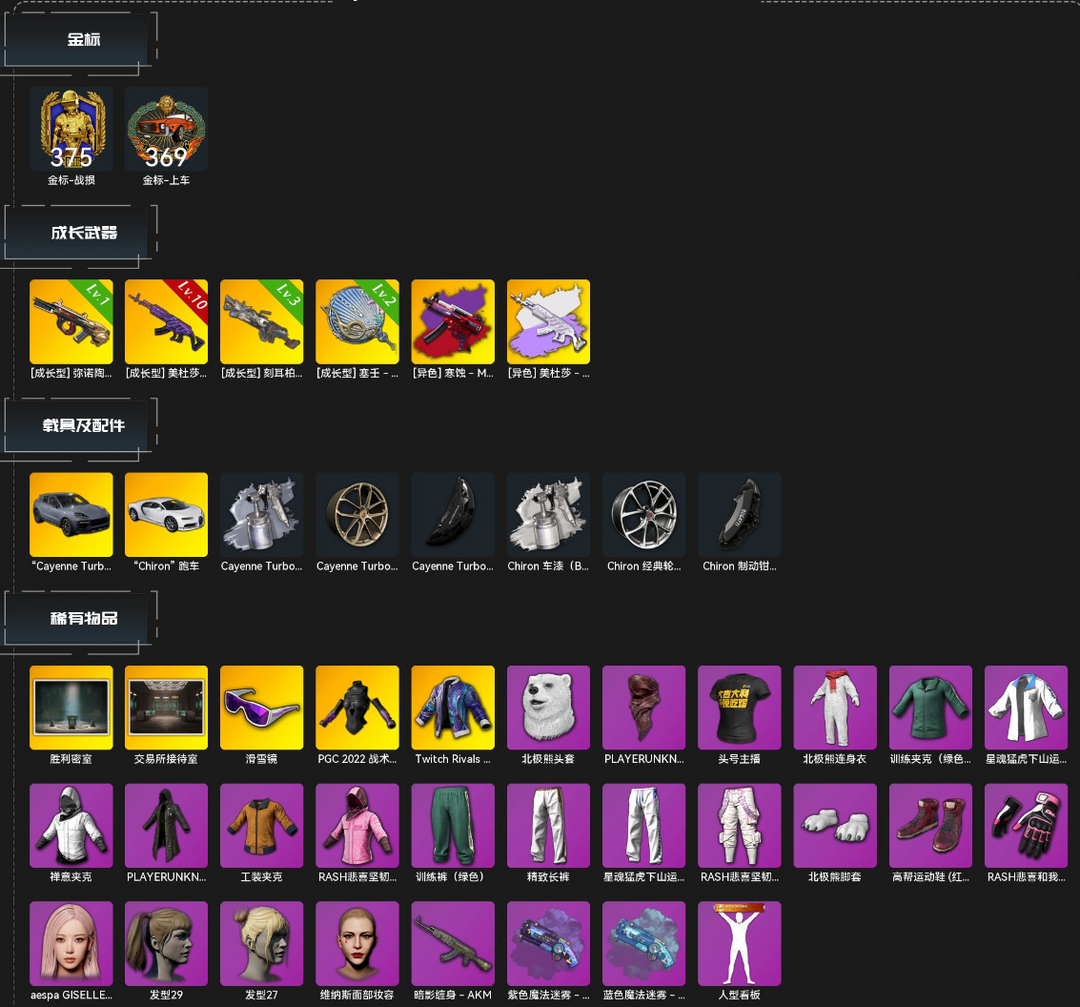装备描述:---家里不要租 家里电脑玩不了--- 布加迪跑车/保时捷SUV/女团GISE套装/满级异色美杜莎/陶洛斯AUG/柏洛斯M249/塞壬锅/烟枪/发光套/滑雪镜/悲喜套/绿柏林套/白战神/绿东南亚/老鼠台夹克/熊脚/双马尾