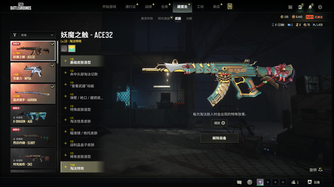 装备描述:二级密码031699十级特效异色妖魔ACE美杜莎762绿头无重力MPK5三级猛虎98K金面丸子头滑雪