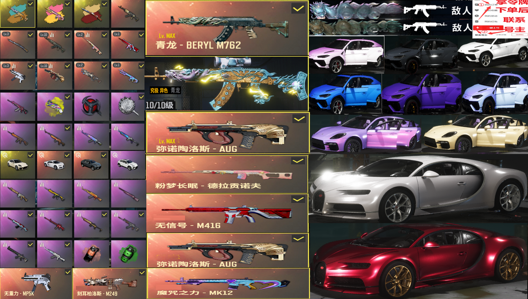 满神器满车布加迪威龙保时捷兰博基尼✅⑩金龙异色青龙M762⑩AUGMP5猛虎信号黑人帕拉梅拉可排位