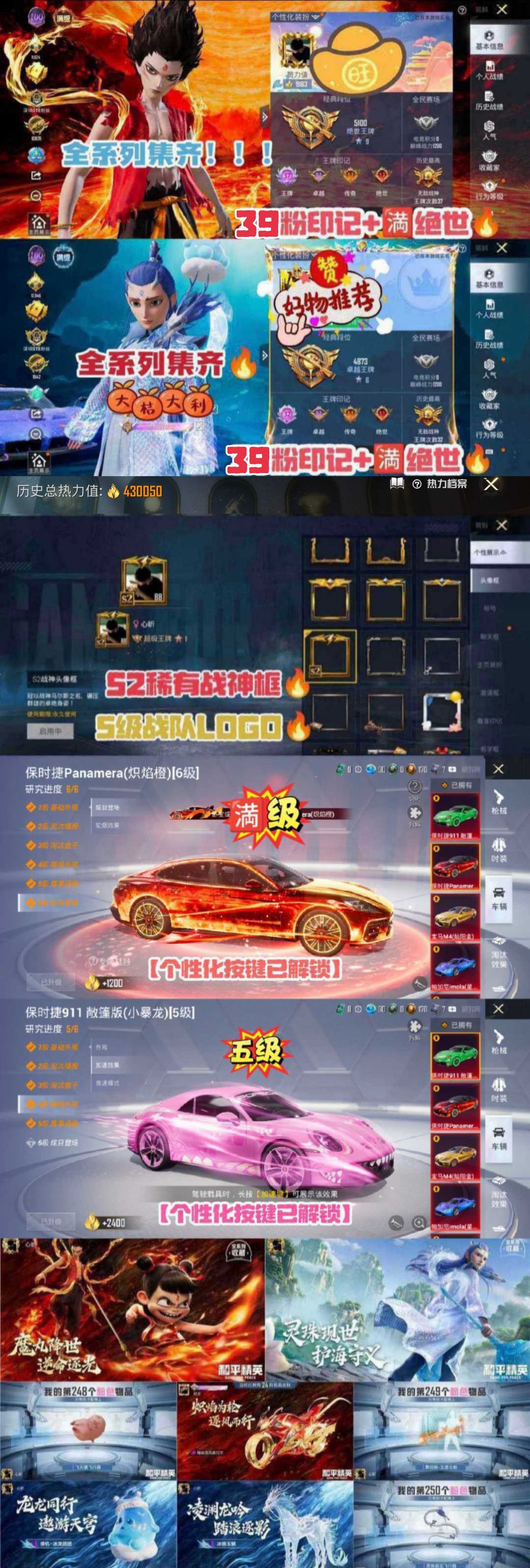 哪吒敖丙全系 满级13套红满绝世S2老框 老101绝版S1 43万热150粉60特34车12升级车
