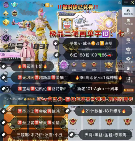 装备描述:两时起 可换头像 包天特 价/满级哪吒/满级宝马/满级敖丙/满级保时捷/满级圣卫者/满级帕修斯/满级初翊/满级瑞拉/满级星梦奇缘/满级烛九/满级云鸾/满级露米娜/满级维塔/满级木乃伊/满级沙丘之主/满级欧若拉/满级敖渊/满级梦海之灵/满级墨龙九天/满级图卡盟/九级最终圣卫者/九级圣斗士/九级圣域龙灵/九级盛世惊鸿/满级金蛇镇世/满级女娲灵识/满级幽焰骑士/满级精灵之光/九级宇宙意志/九级时空协奏/九级魔法神域AK/满级星空领航车9级沙丘/9级女娲/9级精灵/九级金蛇/满级超新星/满级宾利/九级万古烈焰/满级手雷/满级烟雾弹/9级星梦奇缘/九级熔岩统帅/冰马皮肤/金麒麟马皮/粉水晶马皮/满级天马凌跃/满级帕加尼/满级星河领航/满级时空跃影/满级仰望/满级宾利/满级布加迪/路特斯/满级玛莎/满级迈凯伦/金玛莎星际M4/满级至情至圣/满级超新星/小丑女/赤蝎寒蝎/金鞋派对舞王/S1全套/红螳螂/紫螳螂/黄螳螂巡查衣/追光服/老101/都市猎人/怪诞乔克/小丑/天网终结者/小番茄/雪国/单字id/粉丝标/无敌战神框/战神入场特效/巅峰宗师入场特效