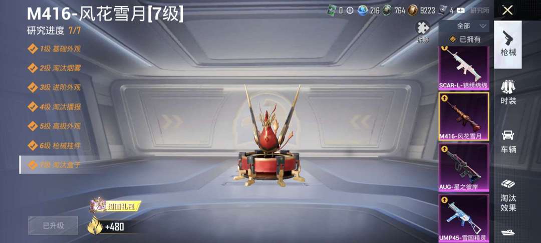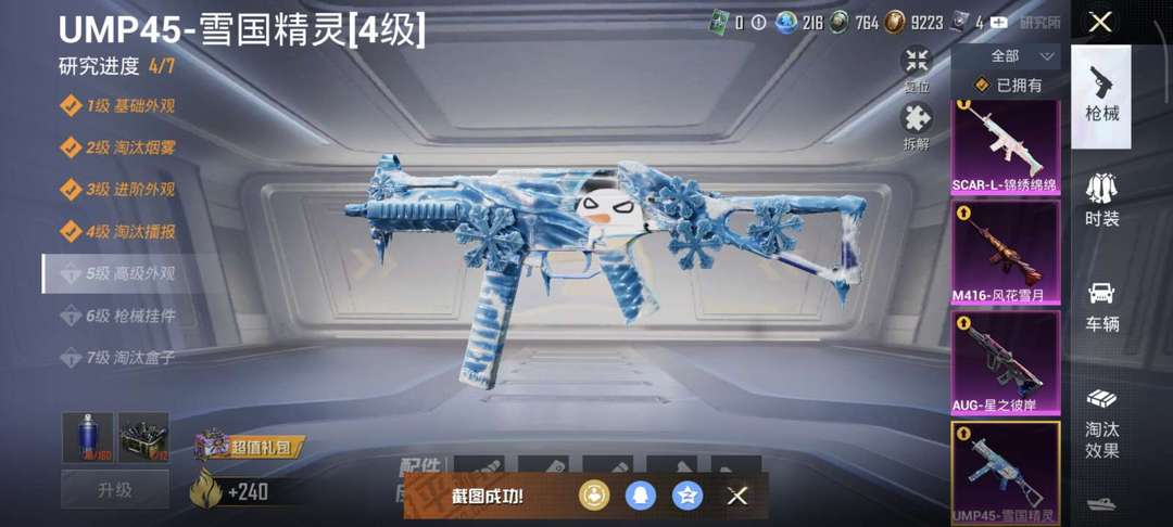 3级欧若拉 7级风花雪月M4 4级星之彼岸AUG 4级雪国精灵UMP45 2级圣域金龙飞行器