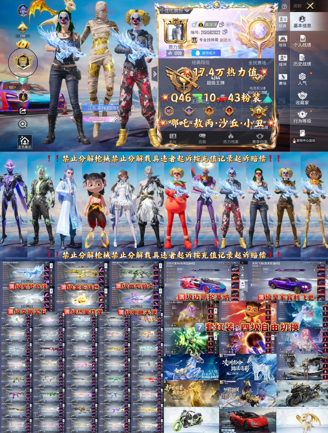 战神特效✨7神装5把9级枪✨满级星梦奇缘金蛇女娲幽焰电糖✨满级迈凯伦宾利✨4级7红43粉46枪11车