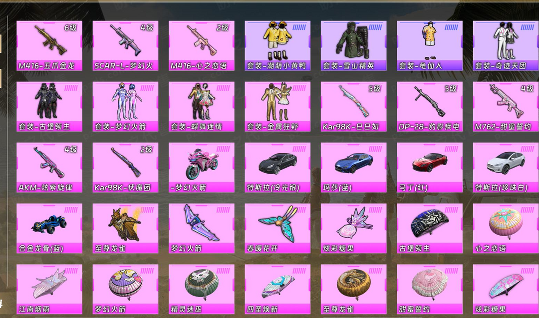 限制: 撤单率<68%才可租用此帐号装备描述:6个载具 【稀有】套装-S1赛事/阿斯顿马丁-轿车红/合金龙骨蓝/双特斯拉/蓝色玛莎拉蒂/梦幻火箭摩托/M416-五爪金龙(五级),M416-心之恋语(4级),M762-甜蜜誓约(4级),AKM-炫紫旋律(4级),SCAR-L梦幻火箭(4级),Kar98K-伏魔团(4级),火箭少女,最牛战神,古堡领主,金属狂野,蝶舞迷情,玄武圣者,纯白誓言,暗月契约,SS1特训,梦幻火箭飞行器,至尊龙雀飞行器,春暖花开飞行器,等等各种武器皮肤,各种衣服时装,新赛季豪华版手册已买,长期更新中!