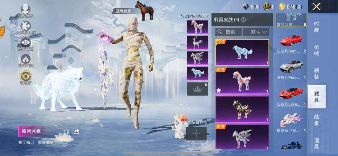 3红装/16粉装/13特效枪/11载具,一投掷物皮肤,m4和AK两个满级9级特效枪,有新狼马皮肤。