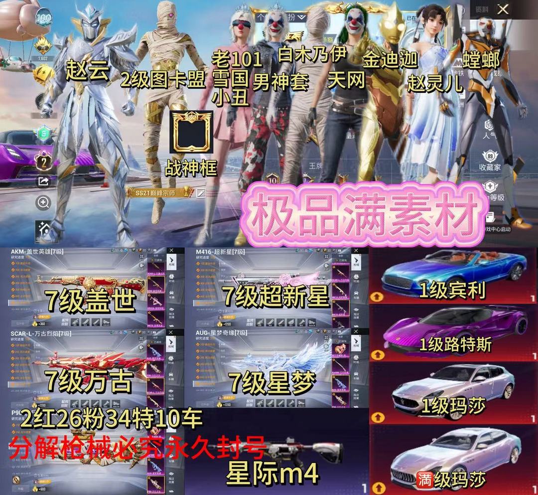 aq1红16粉22特3车战神框6级红装木乃伊图卡盟、7级万古scar、7级幽焰AK、7级至情、7级沙