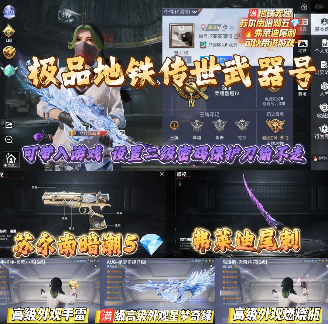 苏尔南暗潮五钻/弗莱迪尾刺/满外观星梦奇缘/地铁燃烧瓶/地铁武器/地铁满天赋
