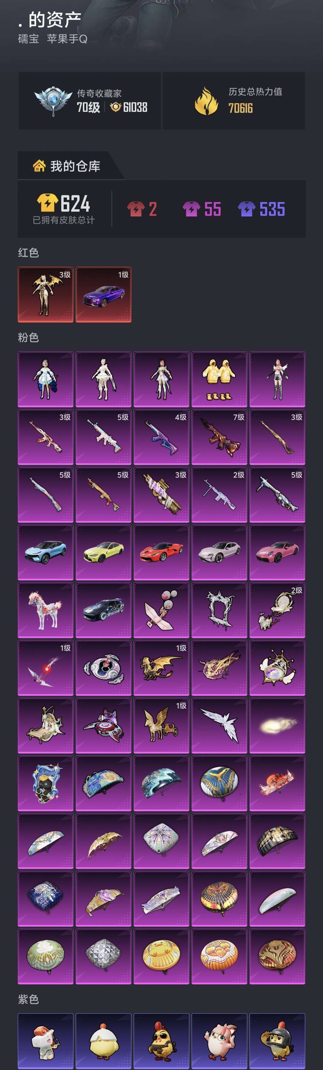 1红装三级龙妈,5粉装,10升级枪,8载具,1僚机,紫色宾利,宝马,法拉利,路特斯,保时捷等