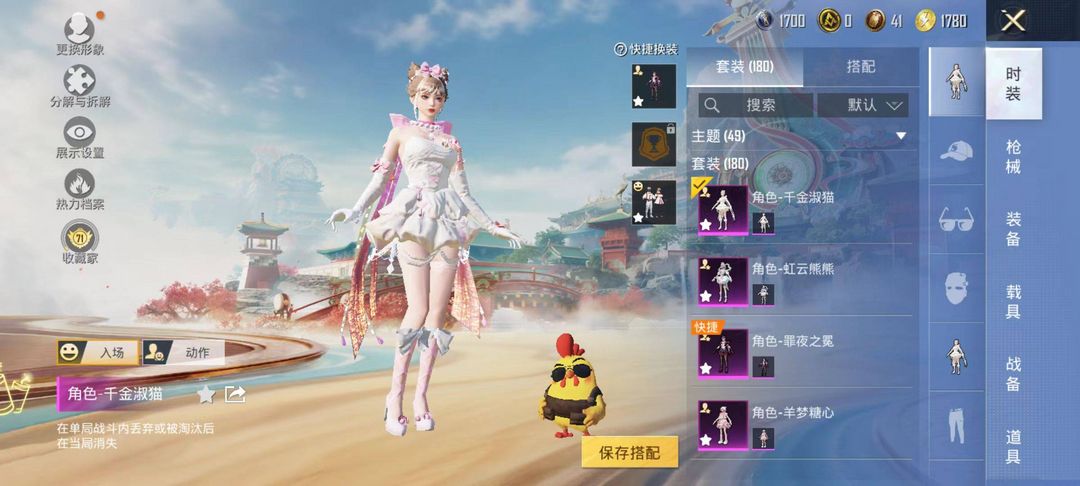 装备描述:9粉/12特粉装-缤纷油彩,套装-浪漫天命,套装-深海小丑鱼,套装-小丑鱼,套装-动感兔斯基人偶服,套装-龟仙人,套装-潮萌小黄鸭,套装-红熊茄茄