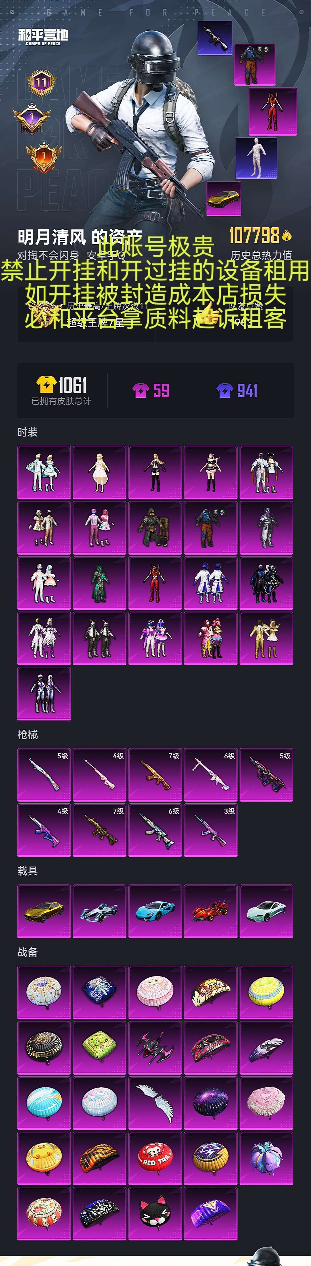 限制: 租号10次及以上 | 撤单率<10%才可租用此帐号装备描述:螳螂木乃伊小丑鼻怪诞乔克m4星际漫游巧克力金玛莎5载具身法号素材号极品号