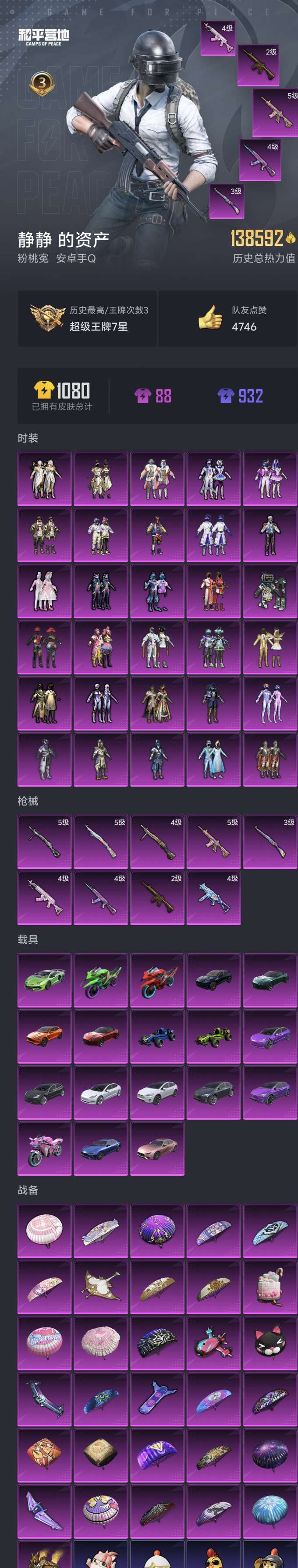 女号 13万热力 30粉装 18车皮肤 8特效枪五爪金龙 快乐主宰 梦幻火箭 雪国梦幻 幻影战神