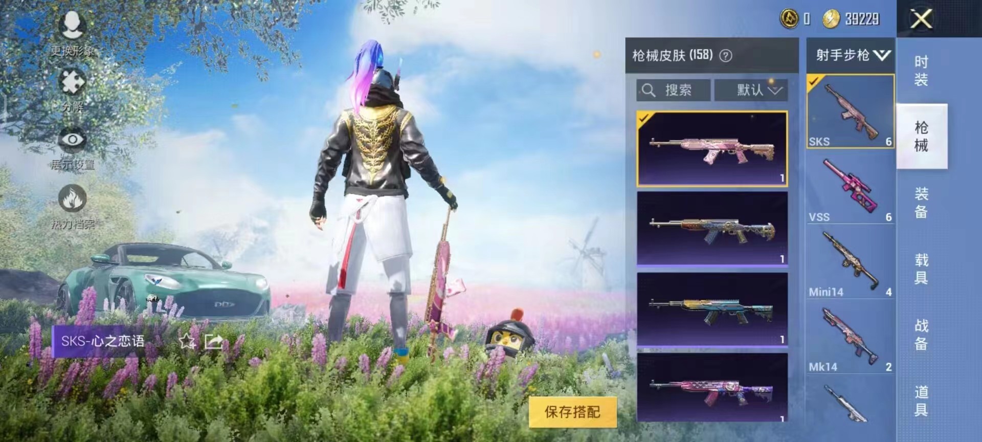 装备描述:绿马丁金羽特工6粉2特效枪7级五爪甜蜜誓约158枪144套装