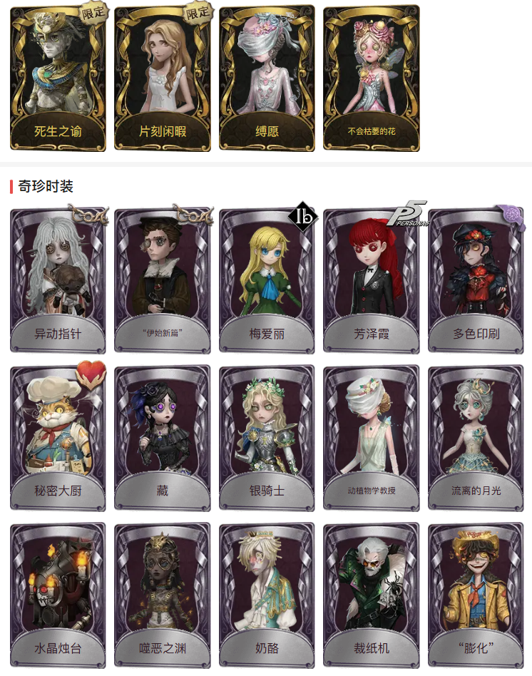 装备描述:【小号】金皮:死生之谕、片刻闲暇、缚愿、不会枯萎的花、紫皮:异动指针、伊始新篇、梅爱丽、芳泽霞、多色印刷、秘密大厨、藏、银骑士、动植物学教授、流离的月光、水晶烛台、噬恶之渊、奶酪、裁纸机、膨化