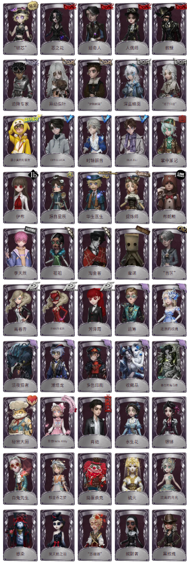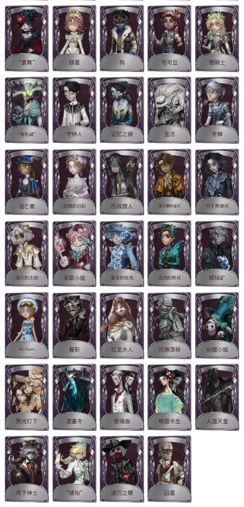 装备描述:金皮:陨星、司药、名誉首席、温室、溯光、异界行者、芙莉莲、聂莫黎、浴火绯花、雨宫莲、椰香假日、菲尼克斯、变彩、盖提亚之遗、缚愿。 紫皮:锁芯、恶之花、嬉命人、人偶师、教鞭、迫降专家、异动指针、伊始新篇、深蓝暗面、巡于归途、蛋小黄的好朋友、OPH.LUCA、时轴颤音、BLK.ELI(先知电竞皮)、掌中篆记、伊布、源自星辰、华生医生、提炼师、布朗熊、李天辰、祖祖、淘金客、摩诺、盲区、高卷杏、PANTHER、芳泽霞、运筹、逐浪的玫瑰、溃夜猎者、潘塔龙、多色印刷、收藏品、善忘的海马体、秘密大厨、异想Hello Kitty、肖驰、永生花、银锑、白兔先生、郁金香之梦、捣蛋裘克、硫火、流离的月光、感染、黑天鹅之羽、苏珊娜、缄默者、黑玫瑰、宴舞、赎星、钨、可可豆、银骑士、有机磷、守钟人、记忆之骑、圣洁、冬蝉、逃亡者、恐惧的旧影、历战猎人、斐乐蒙的圣坛、行于界限间、熄灭的太阳、茶歇小姐、妄念的陈伤、无归的昨日、辉锑矿、re-swim、暮影、红龙夫人、沙滩漂移、长腿小姐、聚光灯下、波塞冬、安魂曲、桃面书生、人造天堂、月下绅士、琥珀、逆刃之鞭、囚星 金挂:光明、进化、毁誉之印、雪莲、折柳、纸扎祠堂、咖啡壶、黄玫瑰之骸、不灭之火 紫挂:结冰的齿轮、落木、回旋镖、漂浮、海之低语、海岸花环、爆燃、全熟、南瓜鬼、醒梦铃、皮鞭、纠缠、法典、蓝玫瑰手杖、活化音响、酩酊、记忆囚笼、拾贝、扑克牌、手摇铃、未奏的乐章、命茧