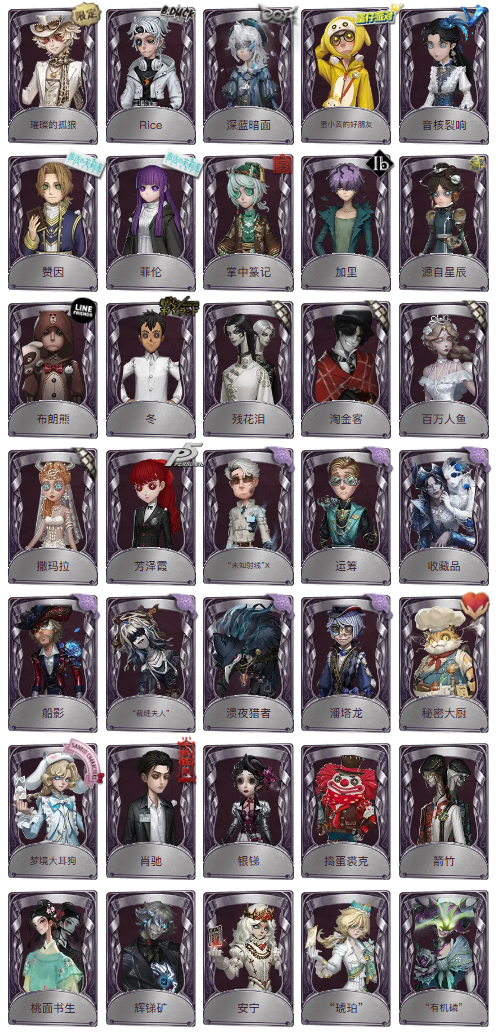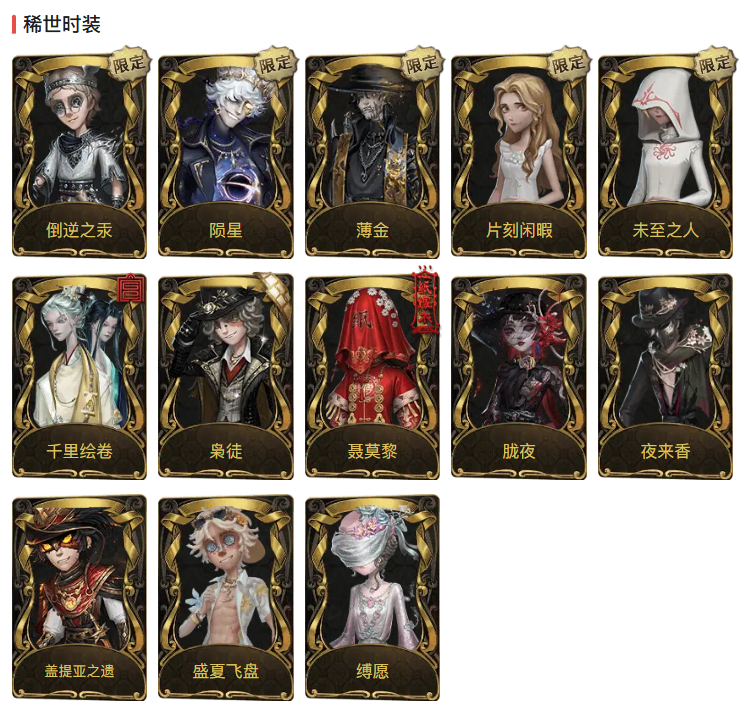 装备描述:金皮:陨星、薄金、倒逆之汞、聂莫黎、千里绘卷、枭徒、胧夜、夜来香、盛夏飞盘、缚愿、片刻闲暇、末至之人、盖提亚之遗 紫皮:璀璨的孤狼、Rice、深蓝暗面、蛋小黄的好朋友、音核裂响、赞因、菲伦、掌中篆记、加里、源自星辰、布朗熊、皮肤冬、残花泪、淘金客、百万人鱼、撒玛拉、芳泽霞、未知射线、运筹、收藏品、船影、裁缝夫人、溃夜猎者、潘塔龙、秘密大厨、梦境大耳狗、肖驰、银锑、捣蛋裘克、箭竹、桃面书生、辉锑矿、安宁、琥珀、有机磷、镏金铜鹿、澄明的理性、暮影、西部大亨、奠柏、衣帽架先生、年岁、斐乐蒙的圣坛、狡、弹簧手、妄念的陈伤、红龙夫人、银骑士、囚星、翡翠女王、熄灭的太阳、无归的昨日、禁闭院长、沙滩漂移、清洁翼、温暖的平安夜、流离的月光、聚光灯下、不愿醒来的女孩、赎星、裁纸机、黑玫瑰。 金挂:致命的邀请函、进化、父亲的怀表、完美人偶、纸扎祠堂、璀璨的荣耀、山水泛舟、宽恕 紫挂:结冰的齿轮、电掣、科学的艺术、笔墨藏锋、极乐熔毁、全熟、醒梦铃、斯劳格、蓝玫瑰手杖、皮鞭、地层石蛋、充气海豚、拾贝、凝聚之水、乐园、魔导书、登峰、月光沙漏、天羽、未奏的乐章、命茧、星钥